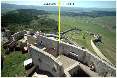 Obrázok. Základom tej najstaršej histórie Slovenov-Slovákov bolo náboženstvo a to stálo na kozmologickom podklade, založenom a odvodenom z prastarej kozmológie a teológie dravidskej Indie. Ostrá Skala, na ktorej stoja zrúcaniny Spišského hradu slúžila od nepamäti ako kozmologické observatórium. Slnko pozorované odtiaľ dosiahlo svoj denno denný zenit nad vrchom, ktorý ešte aj dnes nesie dravidské meno Galmus. Pozri kapitolu č. 4 v Hromník, Cyrilyril Andrew. 2010. Sloveni / Slováci: Kde sú vaše korene? K prameňom najstaršej histórie Slovenska, približne od r. 3000 pr. Kr. Bratislava: Eko-Konzult.